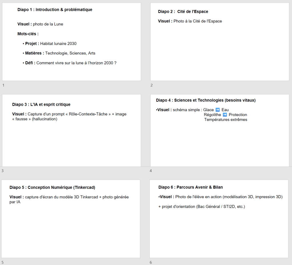 - Interdisciplinarité : j’explique en une phrase que ce projet mélange la Technologie (conception), les Sciences (survie) et les Arts (maquettes).